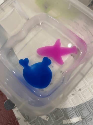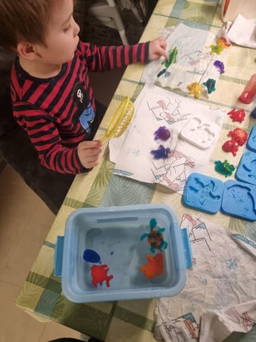 Este senzațională, las poze! Am pus 10 bile într-un pahar cu apă și am amestecat până s-a dizolvat. După ce s-a dizolvat, pui vopseaua în matriță și apoi o scufunzi în apă, tot ce trebuie să faci este să amesteci forma și în câteva secunde se eliberează desenul, apoi ieși din apă cu alginatul și îl pui în apă curată, desenul crește în apă. Mie mi s-a părut foarte distractiv și stimulant pentru fiul meu de 2 ani, am făcut un pește și l-am pus în baie...